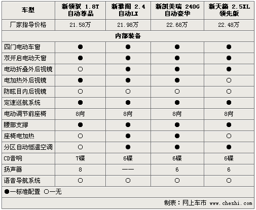 在內(nèi)部裝備方面,四款中級車更是不遺余力的配備各自高端配置,電動天窗、定速巡航、電動座椅、以及自動空調(diào)均稱為四款車的標準配置。但新雅閣、新凱美瑞和新天籟配備的電動折疊外后視鏡,卻沒有出現(xiàn)在新領馭同級車上。此外,新領馭配備的7碟CD和8揚聲器音響系統(tǒng),似乎較其它三款日系車更加悅耳。