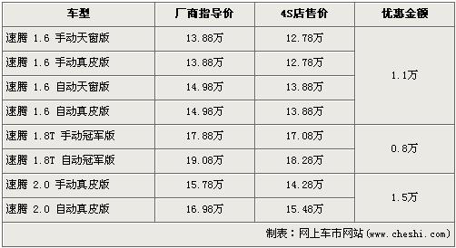 據(jù)北京一汽大眾經(jīng)銷店銷售人員介紹,在上海車展上亮相的速騰1.4TSI最早預(yù)計(jì)將在6月上市銷售,預(yù)售價(jià)格可能不會(huì)低于16萬(wàn)元,此車的上市將會(huì)取代目前在售的速騰2.0升自動(dòng)擋車型。近期購(gòu)買速騰在售車型的消費(fèi)者都可以得到不同程度的優(yōu)惠,速騰1.6L車型優(yōu)惠1.1萬(wàn)元,1.8T冠軍版車型優(yōu)惠8000元,2.0L車型優(yōu)惠金額達(dá)到了全新最高的1.5萬(wàn)元,但是2.0L車型目前店內(nèi)無(wú)現(xiàn)車,預(yù)購(gòu)買者需交訂金1000元,約等一周后可提車。