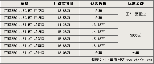 據(jù)4S店銷售人員介紹,目前榮威550銷售的車型主要以1.8T車型為主,其中性價比較高的車型為1.8T品臻型,4S店內(nèi)現(xiàn)在有現(xiàn)車供應(yīng),現(xiàn)金優(yōu)惠5000元左右,到店還可有一定幅度讓利。而1.8L啟悅版、啟逸版和1.8T品仕版則需要預(yù)定,訂金為2000元,需要等一個星期左右。