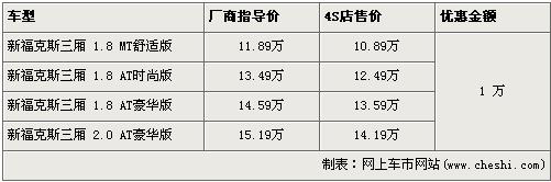 據(jù)長安福特經(jīng)銷商處銷售人員介紹,兩廂新款?怂谷祪(yōu)惠1萬元。兩廂新款?怂狗譃1.8L和2.0L兩種排量,入門級車型的1.8L手動舒適版經(jīng)優(yōu)惠后,售價為10.89萬元。高配的2.0L自動運動版售價降到了14.39萬元。