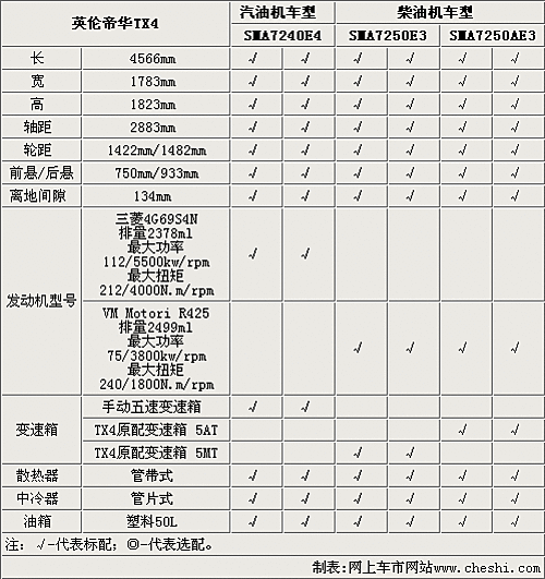 英倫TX4的長寬高分別是4566/1783/1823毫米,雖然是一款A(yù)級車的外形尺寸,但這款車的軸距為2883毫米,達到了一款B級車的水平。TX4分為汽油版和柴油版,汽油版搭載三菱4G69系列發(fā)動機,而柴油版搭載大眾的R425柴油發(fā)動機。從動力數(shù)據(jù)方面來看,柴油版擁有低速高扭的特點,而汽油版的最大功率達到112千瓦,而且具有很好的經(jīng)濟性。TX4汽油版匹配手動五速變速箱,而柴油版卻可以匹配原裝的五速自動變速箱。