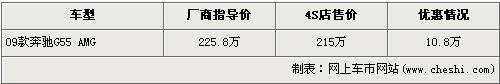 根據(jù)北京奔馳4S店銷售人員介紹,奔馳G55 AMG近期有10.8萬(wàn)元的優(yōu)惠,經(jīng)優(yōu)惠09款奔馳G55 AMG的售價(jià)從225.8萬(wàn)元下降到了215萬(wàn)元。現(xiàn)車方面,店內(nèi)目前還有一輛黑色現(xiàn)車,錯(cuò)過(guò)此車的消費(fèi)者需交10萬(wàn)元訂金,約等半年后才可提車。