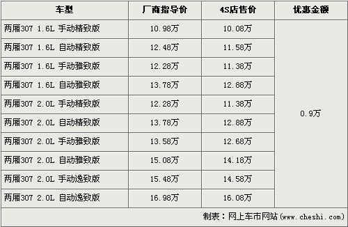 據東風標致經銷店銷售人員介紹,兩廂標致307分為1.6L和2.0L兩種排量,目前全系優(yōu)惠9000元,入門車型的1.6L 手動精致版原廠商指導價為10.98萬元,經優(yōu)惠后僅售10.08萬元,排量稍大的2.0L排量的低配車型手動精致版經優(yōu)惠后售價為11.38萬元。
