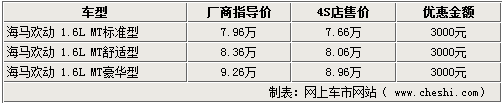 在市場中銷售有段時間的1.6L歡動新車,現(xiàn)已進(jìn)入各個海馬經(jīng)銷商展廳,現(xiàn)車充足顏色齊全。在售的三款新車均為手動版車型。除直接享受國家1.6L車型的購置稅優(yōu)惠政策外,并有現(xiàn)金3千元優(yōu)惠;銷售人員表示,現(xiàn)金優(yōu)惠也可換為等值的裝飾禮包,同樣超值。現(xiàn)金優(yōu)惠配合購置稅優(yōu)惠,則大大減輕了消費(fèi)者的購車負(fù)擔(dān)。