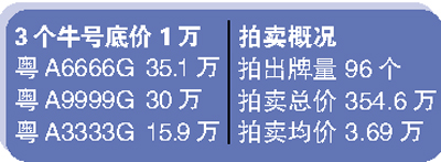 這次競拍會上最受矚目的無疑是粵A3333G、粵A6666G、粵A9999G三個底價1萬的四連號。最后,550號競拍者以35.1萬高價競拍粵A6666G成功,成為本場“標(biāo)王”。而上期標(biāo)王粵A6666G僅拍出16萬元。(記者譚德波)