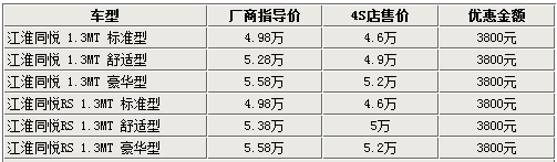 江淮的同悅及同悅RS系列車型,自上市后就吸引了眾多消費(fèi)者關(guān)注。在三廂車型銷售很長(zhǎng)時(shí)間之后,兩廂的RS版終于進(jìn)入了北京市場(chǎng)開始銷售。網(wǎng)站由江淮轎車經(jīng)銷商處了解到,現(xiàn)在RS版以及三廂同悅車型店內(nèi)現(xiàn)車充足,購(gòu)車最高可有3800元的現(xiàn)金優(yōu)惠。具體詳情如下: