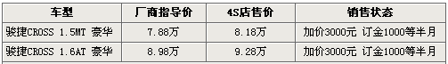 駿捷CROSS上市后,因?qū)儆诜夏贻p人時尚態(tài)度的跨界車型,駿捷CROSS在市場中的受關(guān)注度也相當(dāng)高。據(jù)華晨中華4S店銷售人員表示,駿捷CROSS上市后已有少量展車到店,主要為1.6L的自動豪華型。而現(xiàn)在購車沒有優(yōu)惠,還需要加價銷售,兩款車型均在指導(dǎo)價的基礎(chǔ)上加價3000元。同時店內(nèi)現(xiàn)車不足,仍需預(yù)訂購買,訂金1000元,半個月左右的時間即可提車。