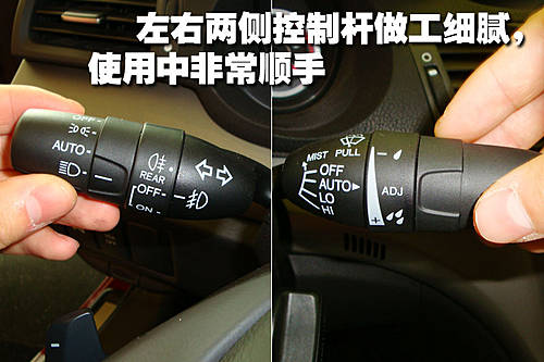 方向盤左右兩側(cè)控制桿為軟橡膠包裹手感細(xì)膩,無論是看、觸都能感覺到這部分材料的工藝質(zhì)量很好。并且旋鈕設(shè)計能夠滿足手指粗大駕駛者的使用及調(diào)節(jié)。