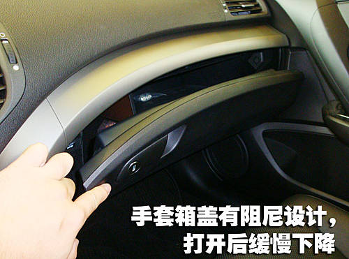 思鉑睿的手套箱為有阻尼設(shè)計,在打開手套箱后不會因重力而自由下落,手套箱內(nèi)部空間較大,分層設(shè)計可以方便乘客查找物品。