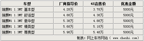據奇瑞瑞麒4S店銷售人員介紹,目前瑞麒M1只在專屬瑞麒4S店內銷售,其它奇瑞的4S店并沒有這款車的銷售權,F(xiàn)在瑞麒M1精英版及1.0車型已經到店銷售,店內1.3L的M1車型已經非常齊全,并且顏色較為豐富。目前購買1.3L瑞麒M1現(xiàn)金方面可優(yōu)惠5000元。