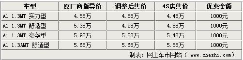 據(jù)奇瑞汽車4S店銷售人員介紹,奇瑞09款A(yù)1目前只有舒適型有現(xiàn)車銷售,原廠商指導(dǎo)價(jià)為5.38萬元,官方降價(jià)后為4.98萬元。A1 1.3L豪華型和新增加的實(shí)力型和自動擋目前都沒有現(xiàn)車,預(yù)訂需要等1-2周才能提到現(xiàn)車。目前購買奇瑞A1全系車型,都可以贈送一款價(jià)值3000元的GPS導(dǎo)航儀一部。