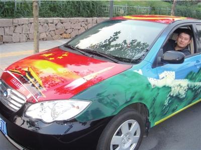 “前機蓋是巨幅的天安門城樓,車身兩側(cè)是鳥巢和長城,在車的頂上,則是60年大慶的圖標!睘橄驀鴳c獻禮,家住天安門附近的林先生和朋友一起在自己的愛車上做了一系列的彩繪,表達對祖國的祝福。