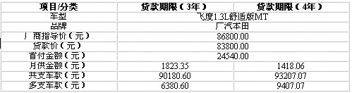 貸款詳解:飛度是小型家用車的典范,這點(diǎn)從它的銷量上就能看出來。缺點(diǎn)么,可能就是大家比較關(guān)心的安全和價(jià)錢問題。總體來說,飛度綜合素質(zhì)較高,是第一臺車的好選擇。該車首付需2萬余元,月供僅需1400余元,對于手頭緊張的消費(fèi)者來說還是比較劃算的。