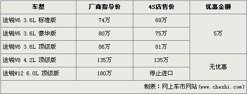 據(jù)經(jīng)銷商銷售人員介紹,途銳的旗艦車型W12缸的6.0L頂配型已經(jīng)停止進(jìn)口。而3.6L的車型有5萬元的優(yōu)惠,最低配的3.6L標(biāo)準(zhǔn)型的售價(jià)從74萬元下跌到了69萬元,首次跌破了70萬元。4.2L頂級(jí)版由于店內(nèi)沒有現(xiàn)車所以沒有優(yōu)惠,欲購買的消費(fèi)者需交訂金10萬元,約等2個(gè)月才可提車。