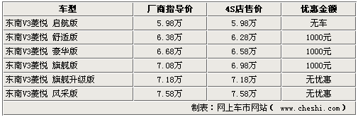 據(jù)東南經(jīng)銷商處銷售人員介紹,目前V3菱悅風采版及升級后的旗艦版正在逐步充足貨源,最低配的車型仍因尚未投產(chǎn)而無法購買,請消費者諒解。V3風采版系列車型各店已少量到店,而升級后的旗艦版V3也正在全國配送當中。銷售人員還說,現(xiàn)在購車不論風采版還是升級的旗艦車型均沒有任何形式的現(xiàn)金優(yōu)惠,僅有精美的裝飾贈送。而老款的V3菱悅旗艦版則可以優(yōu)惠1000元。