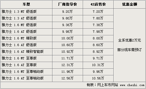 據(jù)廣汽豐田北京地區(qū)4S店銷售人員介紹,現(xiàn)在購買雅力士車型全系優(yōu)惠現(xiàn)金2萬元。目前雅力士1.3車型和1.6舒適、精致均有現(xiàn)車供應(yīng),至尊及銳動版現(xiàn)車數(shù)量較少,部分車型需預(yù)訂,F(xiàn)車顏色以黑色、紫色、銀色為主。如消費(fèi)者有意購買,到店詳談會有更優(yōu)惠的價格。北京地區(qū)各4S店由于訂單不同,各店銷售的現(xiàn)車顏色有所不同。