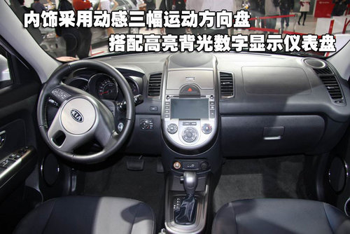 SOUL的內(nèi)飾上突出了強(qiáng)烈的未來感和科技感,三幅運(yùn)動方向盤配合高亮背光數(shù)字顯示儀表盤,中控臺溫馨的色調(diào)設(shè)計(jì)加上夜晚會發(fā)出熒光的座椅。AUX & USB接口可以接入各種多媒體載體,前門兩側(cè)的音響發(fā)光系統(tǒng)隨著音樂有節(jié)奏地律動,配上環(huán)繞全車的8聲道喇叭帶來的完美音效表現(xiàn)和集成了常用控制按鈕的方向盤,在車內(nèi)就能輕松玩轉(zhuǎn)音樂時(shí)尚。