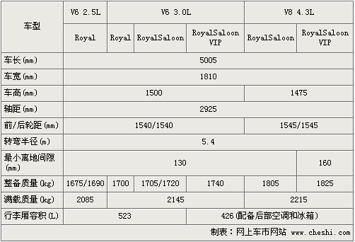 從配置表中可以看出,新一代皇冠共分2.5L,3.0L和4.3L三個(gè)排量共六款車(chē)型,預(yù)計(jì)還將有導(dǎo)航版等車(chē)型推出,車(chē)型總數(shù)將超過(guò)6款。相比現(xiàn)款車(chē)型,全新一代皇冠車(chē)身尺寸全面增加。車(chē)身長(zhǎng)度達(dá)到5005mm,寬度1810mm,2.5和3.0排量車(chē)身高1500mm,4.3排量車(chē)身高1475mm,而軸距更達(dá)到了2925mm,比現(xiàn)款長(zhǎng)出75mm。在裝備質(zhì)量上空載情況下比現(xiàn)款增加60-140kg ,滿載情況下增加80-145kg。