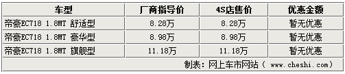 據(jù)北京地區(qū)帝豪4S店銷售人員介紹,帝豪EC718共有三款車型,售價(jià)8.28萬元起。目前店內(nèi)車型顏色不是很全,消費(fèi)者可以到店看車、購買;暫時(shí)沒有的顏色可預(yù)訂,訂金3000元,預(yù)計(jì)交車時(shí)間大概在一個(gè)月左右。全系車型因是新車,所以暫時(shí)沒有現(xiàn)金優(yōu)惠或贈(zèng)品,還請(qǐng)消費(fèi)者諒解。
