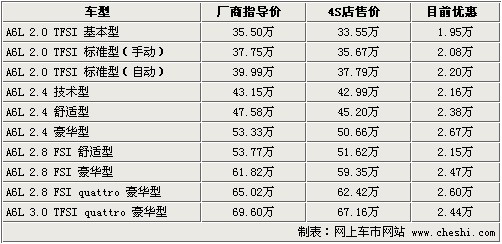 編輯點(diǎn)評(píng):奧迪A6L 2.4升排量車款為主打車型,我們更推薦2.4升技術(shù)型和舒適型,價(jià)格適中配置也較為豐富,目前優(yōu)惠幅度相對(duì)較大。如果您對(duì)配置方面要求不高,我們推薦2.0TFSI標(biāo)準(zhǔn)版車型,動(dòng)力性比2.4升車型更好,價(jià)格也更低。2.8升及3.0升車型符合那些對(duì)于動(dòng)力性要求較高的消費(fèi)者,但銷量要比2.0TFSI和2.4車型少很多。
