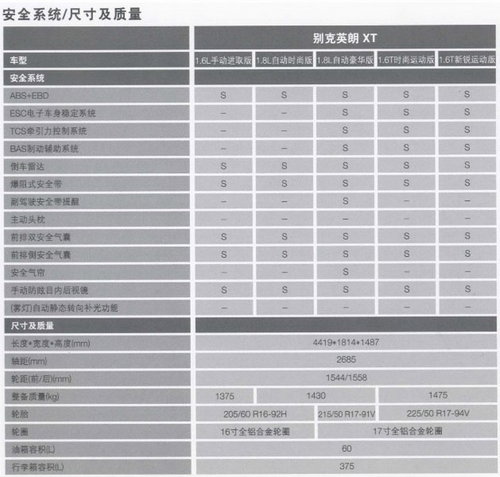別克英朗提供了較多的車輛電子安全系統(tǒng),包括:ABS、EBD、CBC、EDC,最新版本的ESC系統(tǒng)和大尺寸剎車碟。前排4只安全氣囊在同級別車型的配備中算得上是中規(guī)中矩,沒有側(cè)面頭部安全氣簾也許是英朗整車上為數(shù)不多的因成為而妥協(xié)的安全配置。