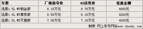 據(jù)吉利汽車4S店銷售人員介紹,現(xiàn)在遠(yuǎn)景1.5L車型不是很齊全,天窗版沒有現(xiàn)車需要預(yù)訂。元旦之前,遠(yuǎn)景1.5L車型全系可以優(yōu)惠5000元,但目前這款車型只能優(yōu)惠4000元。不過銷售人員表示,如果到店購車,除了有4000元現(xiàn)金優(yōu)惠以外,還可以贈(zèng)送全車裝飾。
