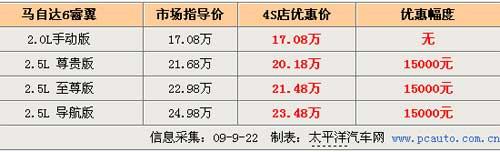 由于宣傳周期過長貨源一直緊缺,睿翼上市后并沒有達到廠家的銷量任務,雖然睿翼定價偏低依舊不能得到消費者認可。目前馬自達6睿翼可優(yōu)惠15000元,并且還可贈送相當可觀的大禮包,現(xiàn)車較為充足。作為馬自達6的升級換代產(chǎn)品,其在北方市場的銷售一直比較平淡,此次降價也是為了更好的迎合市場。馬自達6睿翼安全和舒適性配置比較突出,雙開啟模式電動天窗、方向盤換擋撥片、雙區(qū)獨立控制自動空調系統(tǒng)、6安全氣囊等等,這些都是睿翼的標配,作為一款中高級轎車這樣的配置與同級別車相比還是很有優(yōu)勢的。另外睿翼采用了輕量化車身的設計,整車重量有所減少,在節(jié)油方面功效顯著。