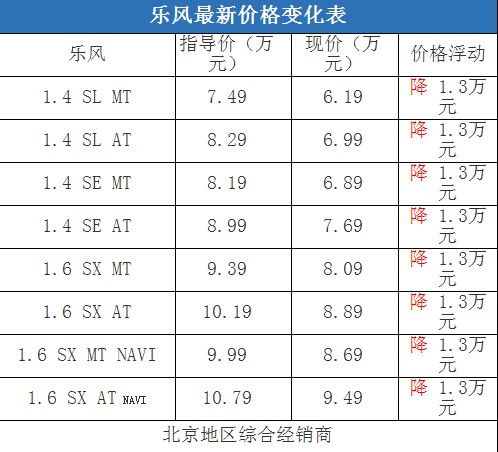 近日,編輯從北京地區(qū)綜合經(jīng)銷(xiāo)商處了解到,雪佛蘭樂(lè)風(fēng)在店內(nèi)的現(xiàn)車(chē)充足,有藍(lán)色、銀色現(xiàn)車(chē),基本上可以滿足消費(fèi)者在春節(jié)前的購(gòu)車(chē)需求;據(jù)經(jīng)銷(xiāo)商透露,目前購(gòu)車(chē)有1.3萬(wàn)元的現(xiàn)金優(yōu)惠,降價(jià)幅度與上個(gè)月相比有所提升。不過(guò)要想以這個(gè)價(jià)格提車(chē),需要在店內(nèi)做購(gòu)車(chē)一條龍,其中車(chē)輛四項(xiàng)基本保險(xiǎn)可以打9折(約合3000-4000元左右)。以下是樂(lè)風(fēng)最新價(jià)格變化表: