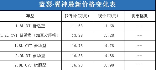 近日,編輯從北京地區(qū)東南三菱4S經(jīng)銷商處了解到,藍(lán)瑟·翼神在店內(nèi)有少量現(xiàn)車(紅色、黑色),其中1.8L CVT舒適型在店中加裝了真皮座椅,價(jià)格是原指導(dǎo)價(jià)增加3000元。相比之下,編輯了解到藍(lán)瑟·翼神在綜合經(jīng)銷商處雖然沒有現(xiàn)車,但是現(xiàn)在訂車可以優(yōu)惠2000元現(xiàn)金,要等到春節(jié)之后才能夠提車。以下是藍(lán)瑟·翼神最新價(jià)格變化表: