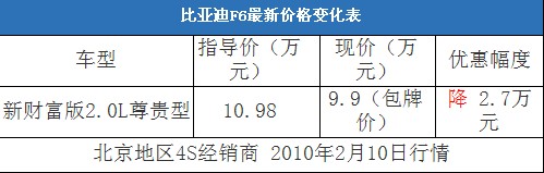 近日,編輯從北京地區(qū)比亞迪4S經(jīng)銷商處了解到,近期比亞迪F6有2.0L尊貴版現(xiàn)車(黑色、銀色)。目前這款車在店內(nèi)正在組織消費者團(tuán)購活動,車輛全款(包括購車一條龍和購置稅、上牌)為9.9萬元,并且贈送價值1000元的汽車裝飾,相當(dāng)于優(yōu)惠了2.7萬元左右。以下是比亞迪F6最新價格變化表: