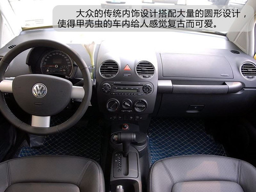 甲殼蟲的內(nèi)飾具有很明顯的大眾特征,各種開關(guān)、按鍵對(duì)于經(jīng)常駕駛大眾車輛的人來說是十分熟悉的。最特別的就是圓桶形的大儀表,速度表最大,幾乎占據(jù)了整個(gè)儀表盤面,中部是行車電腦,置于下方的是油表和轉(zhuǎn)速表。