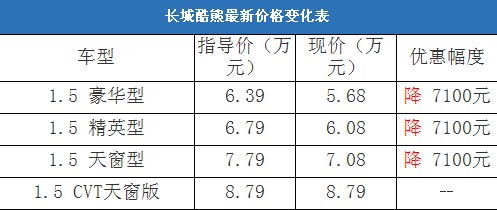 近日,編輯從長(zhǎng)城汽車(chē)4S經(jīng)銷(xiāo)商處了解到,酷熊前段時(shí)間購(gòu)車(chē)送鉆石的促銷(xiāo)活動(dòng)已經(jīng)結(jié)束,目前在店內(nèi)購(gòu)車(chē)沒(méi)有任何優(yōu)惠。相比之下,在綜合經(jīng)銷(xiāo)商處購(gòu)車(chē)的消費(fèi)者可以享受7100元的現(xiàn)金優(yōu)惠。據(jù)經(jīng)銷(xiāo)商透露,酷熊的CVT版車(chē)型也可以預(yù)定,定金為2000元,等待15個(gè)工作日就可以提車(chē),但是購(gòu)車(chē)沒(méi)有任何優(yōu)惠。以下是長(zhǎng)城酷熊最新價(jià)格變化表: