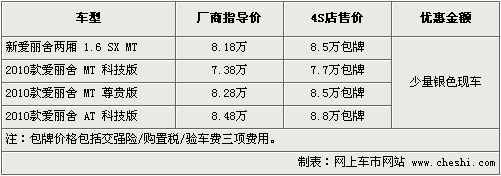 據(jù)東風(fēng)雪鐵龍4S店銷售人員介紹,目前愛麗舍全系車型均為包牌銷售,其中兩廂包牌價8.5萬元,三廂三款車型包牌價分別為7.7萬元,8.5萬元以及8.8萬元。包牌價分別包括了交強險,購置稅和驗車費。對消費者而言節(jié)省了不少的費用,F(xiàn)車方面只有極少量手動科技版現(xiàn)車,顏色以銀色為主。其它車型及顏色需要預(yù)定,訂金1千元,2周左右可以提到車。北京地區(qū)各4S店由于訂單不同,各店銷售的現(xiàn)車顏色有所不同。