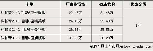 科帕奇車(chē)型分為2.4L與3.2L兩種排量,2.4L手動(dòng)五座舒適版和2.4L七座手自一體豪華版兩款車(chē)型先期上市,2.4L 5座精英版和3.2L排量的車(chē)型隨后也上市銷(xiāo)售,全車(chē)系售價(jià)區(qū)間為22.48萬(wàn)元-37.28萬(wàn)元。近期根據(jù)網(wǎng)上車(chē)市價(jià)格監(jiān)測(cè)顯示,科帕奇2.4L車(chē)型全系優(yōu)惠1萬(wàn)元,具體詳情請(qǐng)看下表: