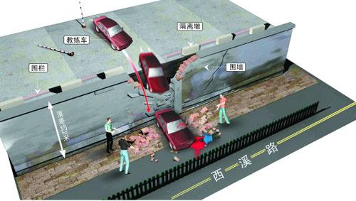 走進(jìn)駕校場地,可以看到,學(xué)車的場地邊有高約20厘米的圍欄和更高更敦實(shí)的隔離墩。從現(xiàn)場看,肇事的教練車先是撞破了圍欄和隔離墩,然后才撞破了圍墻,飛到了落差達(dá)2米之下的人行道上。
