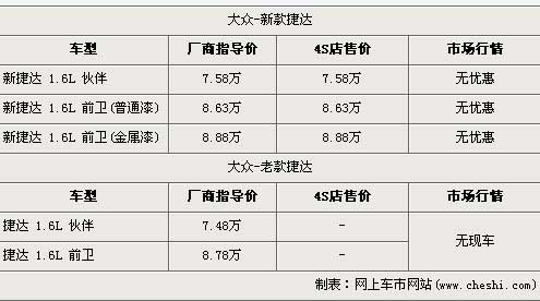 據(jù)北京一汽大眾經(jīng)銷(xiāo)店銷(xiāo)售人員介紹,大眾全新捷達(dá)1.6L分為伙伴版以及前衛(wèi)版兩種車(chē)型,售價(jià)分別為7.58萬(wàn)元和8.88萬(wàn)元,由于前衛(wèi)版白色車(chē)型采用的是普通漆油料,所以在廠商指導(dǎo)價(jià)方面會(huì)比前衛(wèi)版其他顏色車(chē)型便宜2500元,售價(jià)為8.63萬(wàn)元。銷(xiāo)售人員還介紹,老款的大眾捷達(dá)已經(jīng)沒(méi)有現(xiàn)車(chē),消費(fèi)者已經(jīng)無(wú)法購(gòu)買(mǎi)到。