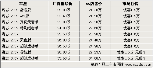 豐田銳志作為一款以運(yùn)動(dòng)著稱(chēng)的后驅(qū)中級(jí)車(chē),在性能以及操控各方面表現(xiàn)都令人滿(mǎn)意,尤其是獨(dú)具個(gè)性的改裝潛力,讓很多癡迷運(yùn)動(dòng)的車(chē)迷們找到了充分的駕 駛樂(lè)趣。銳志配備有2.5L和3.0L兩種排量的發(fā)動(dòng)機(jī),同時(shí)超長(zhǎng)的軸距設(shè)計(jì)讓乘員的空間也有了非常理想的狀態(tài)。近日根據(jù)網(wǎng)上車(chē)市價(jià)格監(jiān)測(cè)系統(tǒng)顯示,目前 購(gòu)買(mǎi)銳志車(chē)型,最高可享受到1.8萬(wàn)元的現(xiàn)金優(yōu)惠。具體車(chē)型見(jiàn)下表: