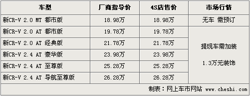 3月5日東風(fēng)本田正式推出全新的CR-V,分為2.0L及2.4L兩種排量,共計(jì)六款車(chē)型,售價(jià)18.98萬(wàn)元-26.28萬(wàn)元,比老款增加了導(dǎo)航版車(chē)型,新CR-V在配置方面更加完善。根據(jù)網(wǎng)上車(chē)市價(jià)格監(jiān)測(cè)系統(tǒng)顯示,全新上市的CR-V目前加價(jià)數(shù)額與3月基本相同,提現(xiàn)車(chē)需加裝1.3萬(wàn)元裝飾。具體車(chē)型售價(jià)見(jiàn)下表: