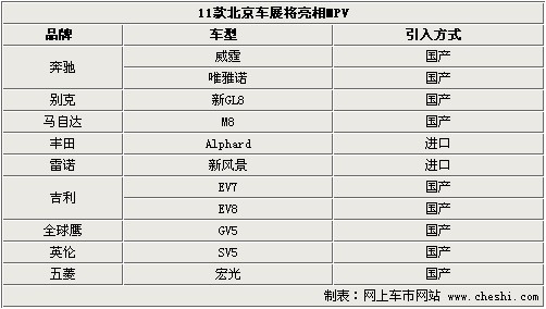 這次在2010北京車展上展出的MPV共有十余款,我們選擇了奔馳、別克、馬自達、雷諾、豐田、吉利、全球鷹、英倫、五菱共9個品牌11款車型。在國內(nèi)知名度相對較高的車型有別克GL8,馬自達8以及五菱宏光。下面將為您奉上這十余款車型的詳細介紹,希望您能夠喜歡。