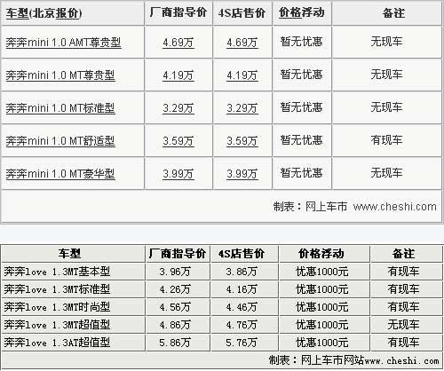 長安奔奔系列在國內(nèi)微型轎車市場可算是家喻戶曉,隨著系列產(chǎn)品的不斷繁衍,目前該品牌系列共推出了奔奔i、奔奔love和奔奔mini三款車型。目前奔奔I車型已經(jīng)全面停產(chǎn),其他兩款車型繼續(xù)在國內(nèi)小型車市場打拼,由于車型定位年輕,關(guān)注度也十分高。網(wǎng)上車市最近走訪了長安汽車北京地區(qū)4S店,對奔奔love和奔奔mini兩款車最新的市場情況進(jìn)行了了解,具體信息請參考下表: