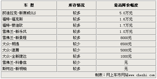 我們選取了目前市場(chǎng)上熱銷(xiāo)的大眾朗逸、福特?怂沟10款車(chē)型。經(jīng)過(guò)我們?cè)诒本┦袌?chǎng)的調(diào)查后發(fā)現(xiàn),這些車(chē)型目前的庫(kù)存量較上個(gè)月均有所上升,大部分車(chē)型的價(jià)格開(kāi)始出現(xiàn)松動(dòng),最高降幅達(dá)5萬(wàn)元。而也有部分新上市不久的車(chē)型價(jià)格仍然堅(jiān)挺,但是現(xiàn)車(chē)明顯增多。