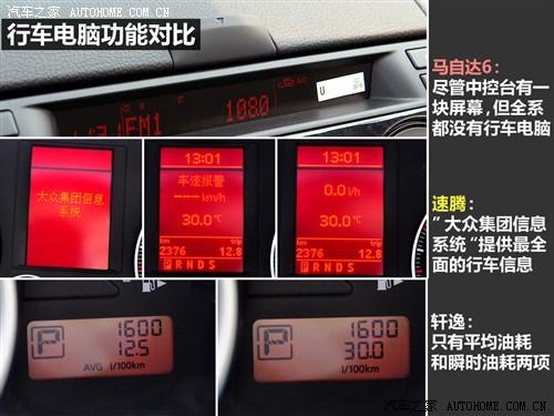 在這方面,馬自達6表現(xiàn)出了中型車的一些優(yōu)勢,有軟性材質(zhì)的中控臺、四門一鍵上下的車窗、鋁合金全尺寸備胎和四方向調(diào)節(jié)的多功能方向盤,只是因為設(shè)計年代較早而沒有行車電腦;速騰的表現(xiàn)也不錯,他有手感最好的中控面板和最強大的行車電腦,但備胎不能令人滿意,做工也出現(xiàn)一點瑕疵;軒逸在這方面并沒有表現(xiàn)出日系車型的優(yōu)勢,這里體現(xiàn)出了一些他在成本上控制比較嚴格的不足。