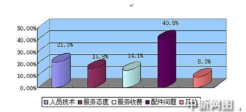 統(tǒng)計(jì)表明,服務(wù)收費(fèi)、服務(wù)態(tài)度和配件供應(yīng)在關(guān)于服務(wù)質(zhì)量的投訴中占到70%以上。同一故障反復(fù)修理過(guò)程中工時(shí)等費(fèi)用該由誰(shuí)承擔(dān)的反映仍十分突出;而配件方面的投訴主要表現(xiàn)在配件供應(yīng)及時(shí)性、配件價(jià)格過(guò)高及質(zhì)量不能保證等方面。具體構(gòu)成比例:人員技術(shù)占21.3%,服務(wù)態(tài)度占15.8%,服務(wù)收費(fèi)占14.1%,配件問(wèn)題占40.5%,其他占8.3%。