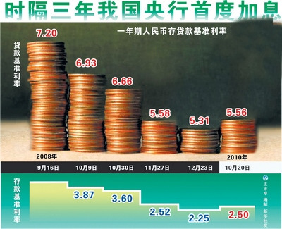 出乎市場(chǎng)的意料,中國(guó)人民銀行19日晚間突然宣布,自2010年10月20日起上調(diào)金融機(jī)構(gòu)人民幣存貸款基準(zhǔn)利率。這是我國(guó)央行時(shí)隔3年后的首度加息,央行為何選擇此時(shí)加息?加息是否意味貨幣政策突變?加息對(duì)金融市場(chǎng)和房地產(chǎn)市場(chǎng)將產(chǎn)生怎樣的影響,新華社記者就此采訪了相關(guān)的專家和學(xué)者。