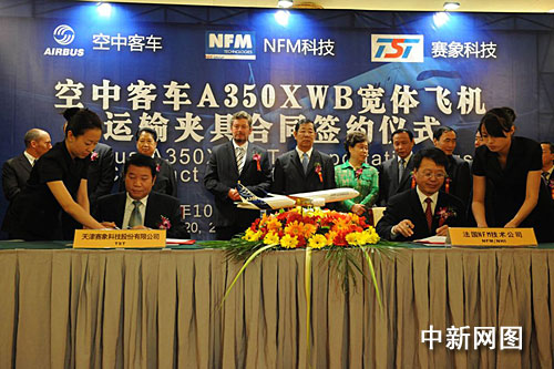 中新網天津10月20日電(郭曉帆)10月20日,空中客車公司與北方重工集團旗下的法國NFM科技公司,在天津簽署總額約3000萬美元的空客A350XWB寬體飛機專業(yè)運輸夾具設計與制造采購合同。根據合同,至2016年,北方重工集團控股的NFM科技公司將為空客公司最新推出的飛機項目——A350XWB寬體飛機分批設計和制造專業(yè)運輸大部件夾具80套,用于將分布在歐洲各工廠的A350XWB寬體飛機大部件,運送到法國圖盧茲的A350XWB飛機總裝線。