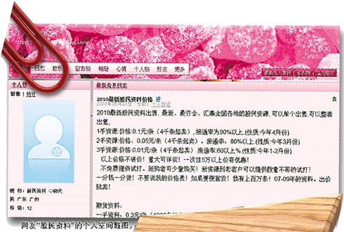 有人在網(wǎng)上發(fā)布叫賣廣告,有人在博客上叫賣,有的人在個(gè)人QQ空間里叫賣,更多的人則在一些網(wǎng)站上反復(fù)發(fā)帖叫賣。甚至有一個(gè)專門的“股民信息吧”,討論股民信息。這些網(wǎng)頁(yè)都宣稱,他們掌握的資料“最新”、“最準(zhǔn)確”、“來(lái)源權(quán)威”。