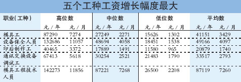 工資增長(zhǎng)幅度最大的5個(gè)工種分別是模具工,增長(zhǎng)了56.53%,年平均工資達(dá)到了41151元;設(shè)備保全人員,增長(zhǎng)了48.64%,年平均工資達(dá)到了49166元;印后制作工,增長(zhǎng)了47.04%,年平均工資達(dá)到了20879元;通訊交換設(shè)備調(diào)試工,增長(zhǎng)了42.31%,年平均工資為33517元;模具工程技術(shù)人員,增長(zhǎng)了41.86%,年平均工資高達(dá)87119元。(具體工資情況可見表格)