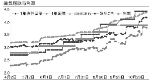 從央行與商業(yè)銀行的互動(dòng)以及資金的供需均衡來看,加息也應(yīng)該是合理的。發(fā)行定向票據(jù)和提高準(zhǔn)備金率實(shí)際上減少了銀行的盈利空間,因此加息則對(duì)銀行而言可以起到補(bǔ)償作用。最近提高準(zhǔn)備金率而隨后沒有加息,但是,央票的利率迅速上升在一定程度上補(bǔ)償了銀行利潤損失。未來一個(gè)月,如果央行要保持18.5%以下的貨幣增速,在貨幣乘數(shù)穩(wěn)定的情況下,12月必須提高一次準(zhǔn)備金率,那么央行應(yīng)該順勢(shì)加息一次;否則,央票利率肯定要上升,重復(fù)11月的過程,其表現(xiàn)就是央行所說的市場行為。