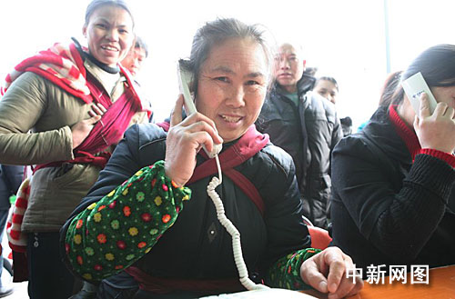 這位民工朋友告訴記者,這是他這幾天來第一次給家里打電話。由于這幾天杭州、湖南、安徽等地下大雪,火車或晚點或停開,他和許多同鄉(xiāng)一樣滯留在火車站,手機(jī)早沒電了!岸嗵澯辛穗娦诺拿赓M(fèi)電話,才跟家里聯(lián)系上,報個平安,免得他們擔(dān)心,你看他們都跟我一樣在報平安!彼钢旁谂赃呉婚L溜的旅客說。