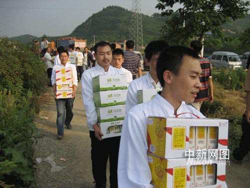 結(jié)合實(shí)際情況,從伊利邛崍工廠劉志亮帶來的救援人員和綿陽云永剛組織的人員 20人,加上一些在當(dāng)?shù)氐闹驹刚,我組織了幾十個(gè)人隊(duì)伍,決定把牛奶靠人力搬進(jìn)去,搬去體育場,并發(fā)給災(zāi)民。晚上看他們拍的照片,發(fā)現(xiàn)真是一支浩浩蕩蕩的搬牛奶的隊(duì)伍。